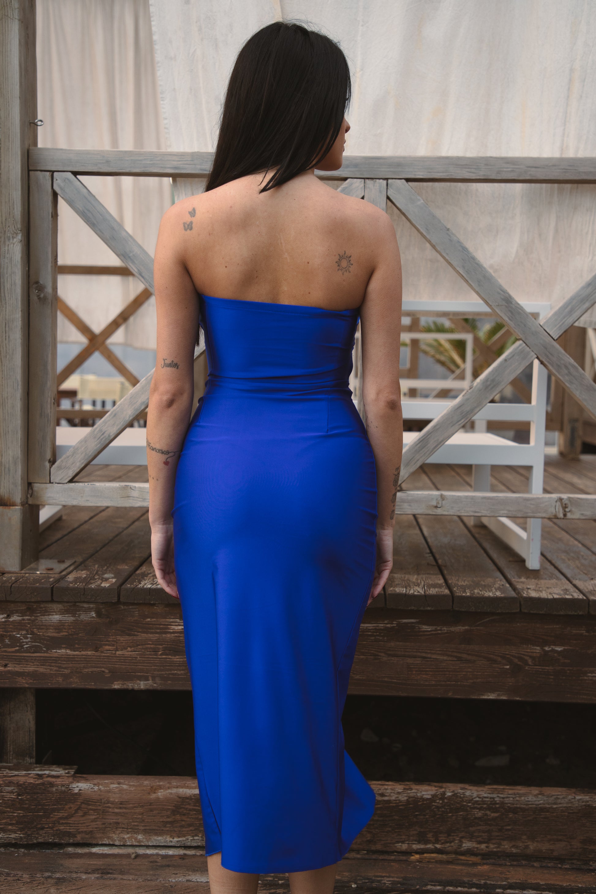 Abito lungo aperto sulla pancia con un dettaglio argento